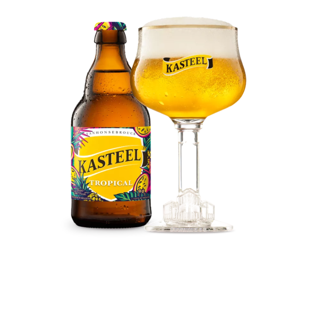 Kasteel Tropical is a Belgian fruit beer brewed by the Vanhonsebrouck brewery. It is known for its vibrant yellow colour and tropical flavours of passion fruit, pineapple, and mango. It has a dry, slightly bitter aftertaste with lingering tropical notes. The beer’s primary scent comes from passion fruit, with hints of sweetness from the pineapple.