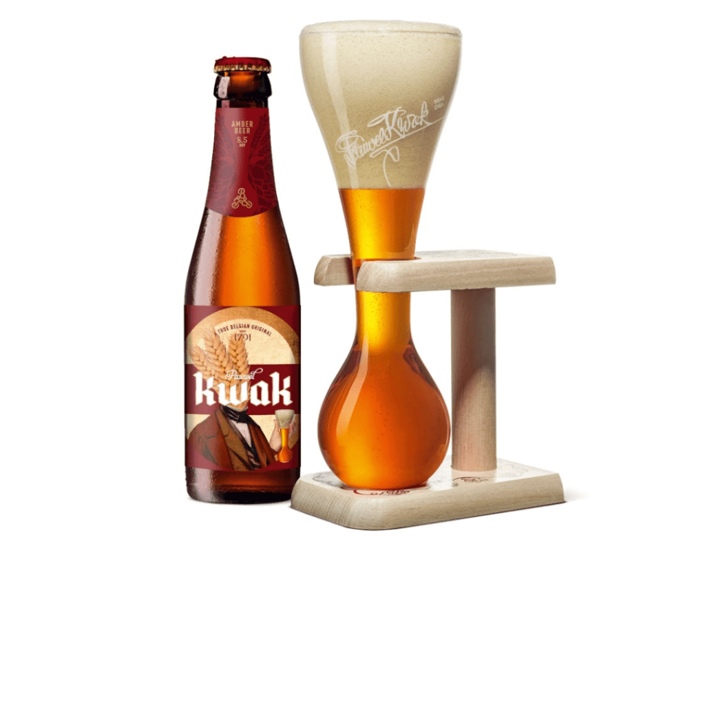 Pauwel Kwak is a Belgian beer brewed by Bosteels in Buggenhout. It is a traditional strong Belgian amber ale, a perfect blend of malt and hops with a wonderful complexity of flavour. Kwak is a warming beer with hints of liquorice and a slightly spicy character of coriander and hops. There is a subtle aroma of banana, pineapple and mango.