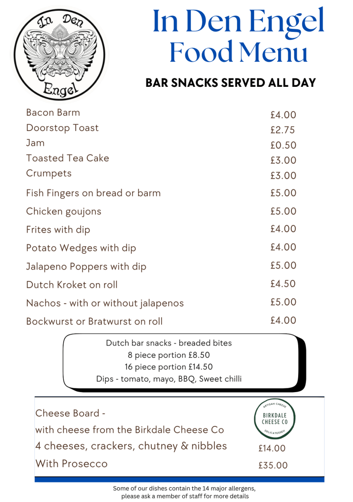 Breakfast, lunch and light nibbles are available all day, from open till close at In Den Engel. From crumpets to Kroketten, try our food menu next time you’re in!